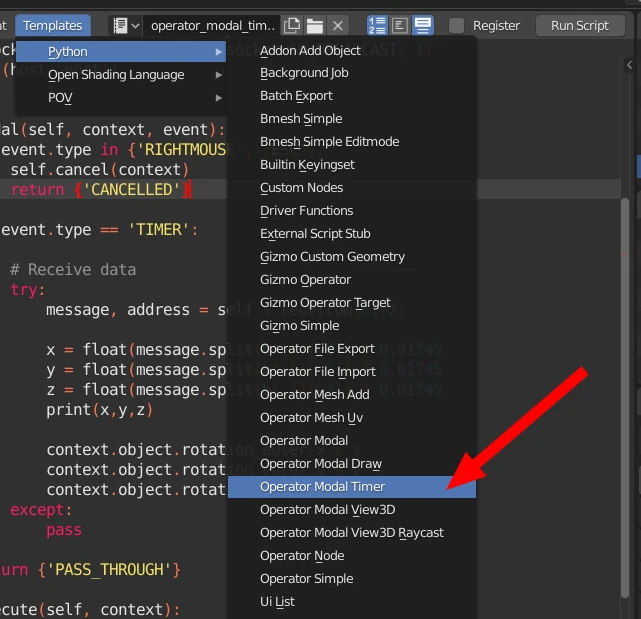 And inside the modal method under TIMER event we substitute the default code with our code to parse the received data.