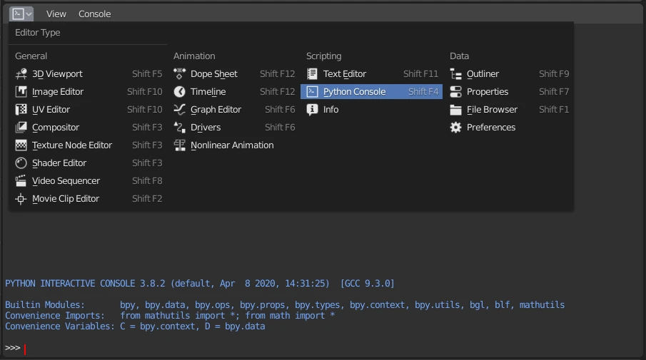 First of all you need a place to interact with blender via python, for that we use the Python Console: