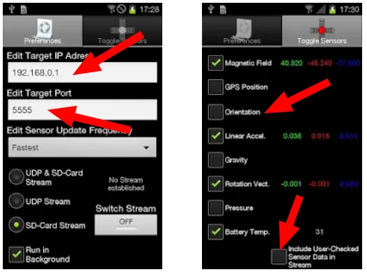 To send SmartPhone sensor data via UDP packets to our computer in order to use it inside blender we can use any of the available apps, for this example we are going to use Sensor stream IMU+GPS android app.