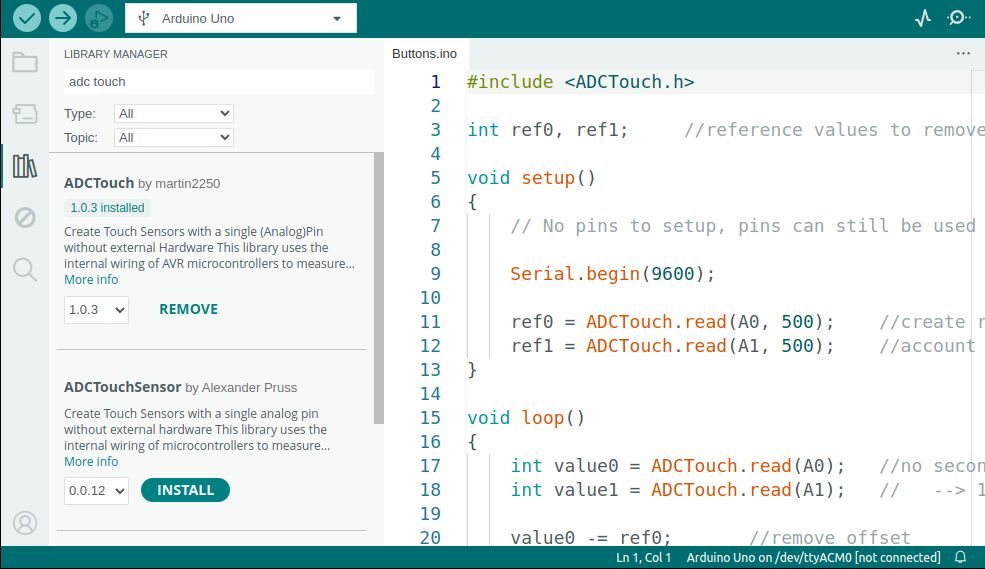 Primero que nada hay que instalar la librería ADCTouch para Arduino.