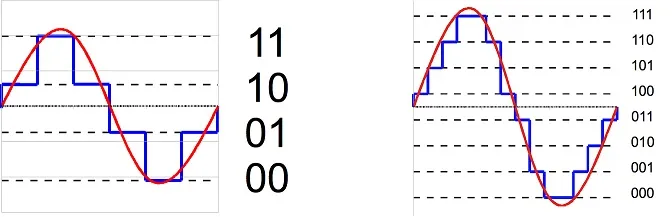 Digitaly encoded signals are discrete representation of analog values with step that vary their size depending on the resolution: