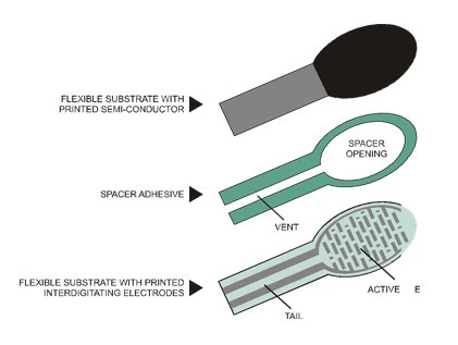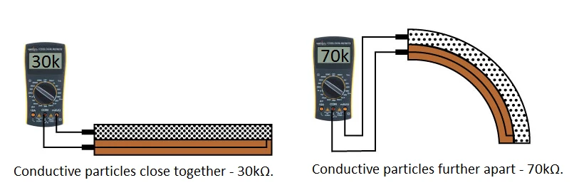 One side of the sensor is printed with a polymer ink that has conductive particles embedded in it. When the sensor is straight, the particles give the ink a resistance of about 30k Ohms. When the sensor is bent away from the ink, the conductive particles move further apart, increasing this resistance (to about 50k-70K Ohms when the sensor is bent to 90°, as in the diagram below).
