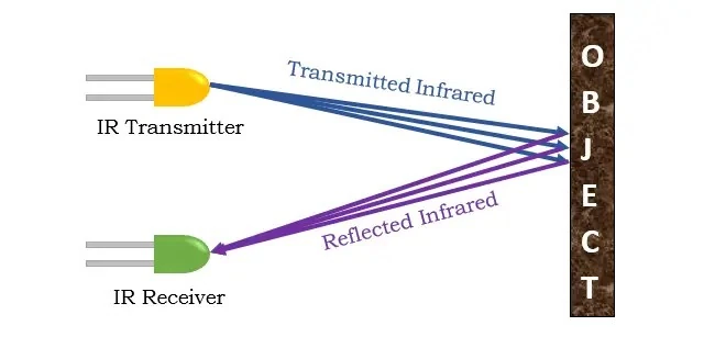 IR, in short for infrared, detects the presence of an object by emitting a beam of infrared light. It works similarly to ultrasonic sensors, though instead of using sonic waves, IR is transmitted. Infrared proximity sensors consist of an IR LED that emits, and a light detector for detection of reflection.
