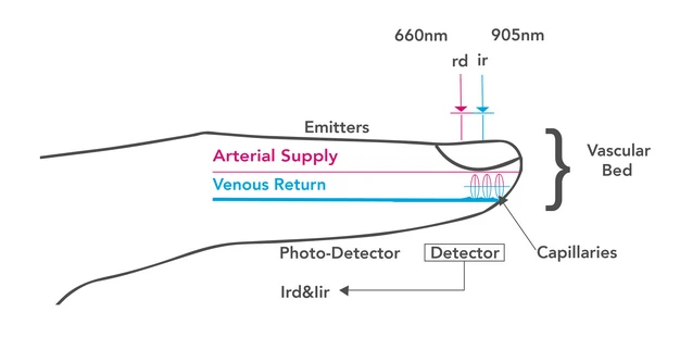 An instrumentation amplifier to measure heart rate (and oftentimes respiratory rate) from the electrocardiogram, a light-emitting diode, and photosensor pair to measure heart rate, respiration, and blood oxygen from the photoplethysmograph, a thermistor or non-contact infrared sensor to measure temperature, and an accelerometer to measure activity.