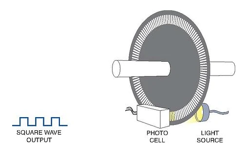 Optical: This uses a light shining onto a photodiode through slits in a metal or glass disc. Reflective versions also exist. This is one of the most common technologies. Optical encoders are very sensitive to dust.