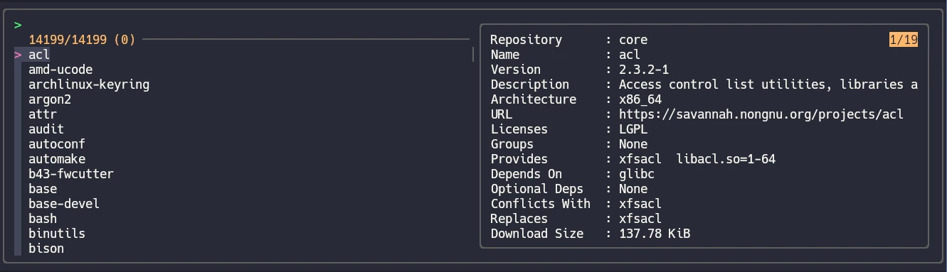 pacman -Slq: lista todos los paquetes disponibles.fzf --multi --preview: Nos permite seleccionar uno o varios paquetes con fzf.- La opción